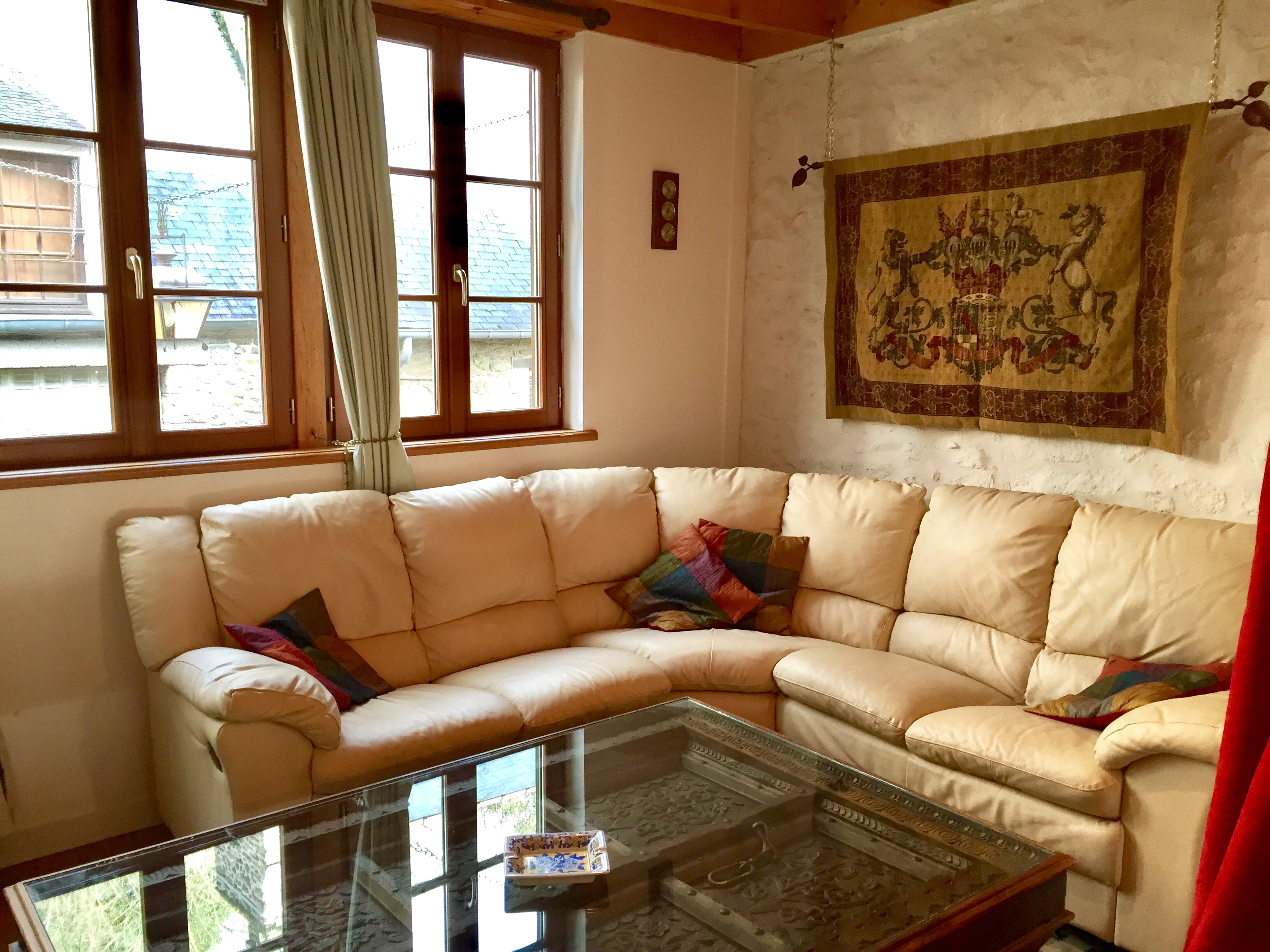 This self catering apartment is bright and airy, comprising the living room, dining area and kitchen. The living room which is situated at the front of the property is graced with large windows over looking the cobbled street lined with traditional Breton houses dating back to the 1400's. For your comfort the living room is furnished with a 6 seater lounge, 2 arm chairs, broadband internet.